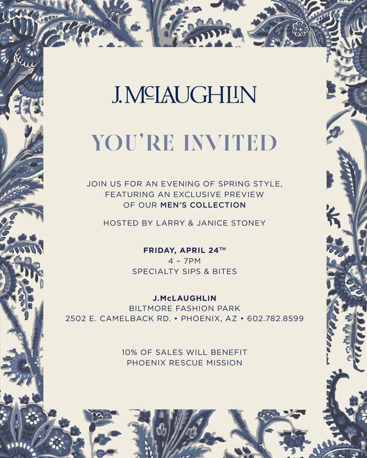 Join us at J. McLaughlin at Biltmore Fashion Park for an evening of spring style, featuring an exclusive preview of the Men’s Collection, hosted by Larry & Janice Stoney. Enjoy...